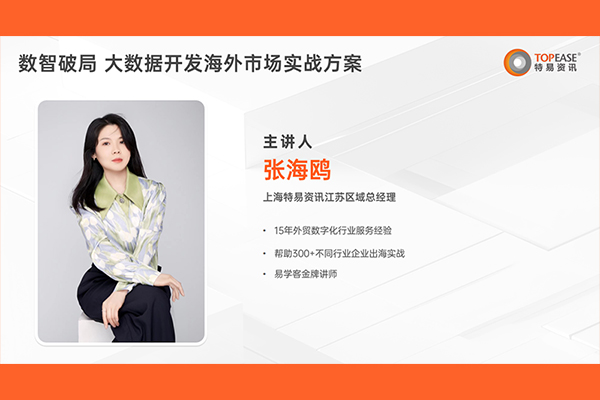 2025-07-14 5572025年7月,南京外贸促进会举办行业交流活动,特易资讯江苏区域总经理张海鸥受邀发表《数智破局:大数据开发海外市场实战方案》主题演讲。依托15年外贸数字化服务积淀及300余家企业出海实战经验,张海鸥系统剖析当前外贸发展态势,全面阐述大数据与AI技术在海外市场开发中的应用逻辑与实施路径,为外贸企业数...