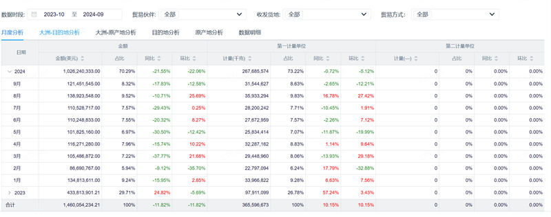 时间排名:支持按 “年度、季度、月度” 生成排名,例如查询 “2024 年 Q2 茶叶出口主要采购国排名”,及时捕捉短期市场波动;