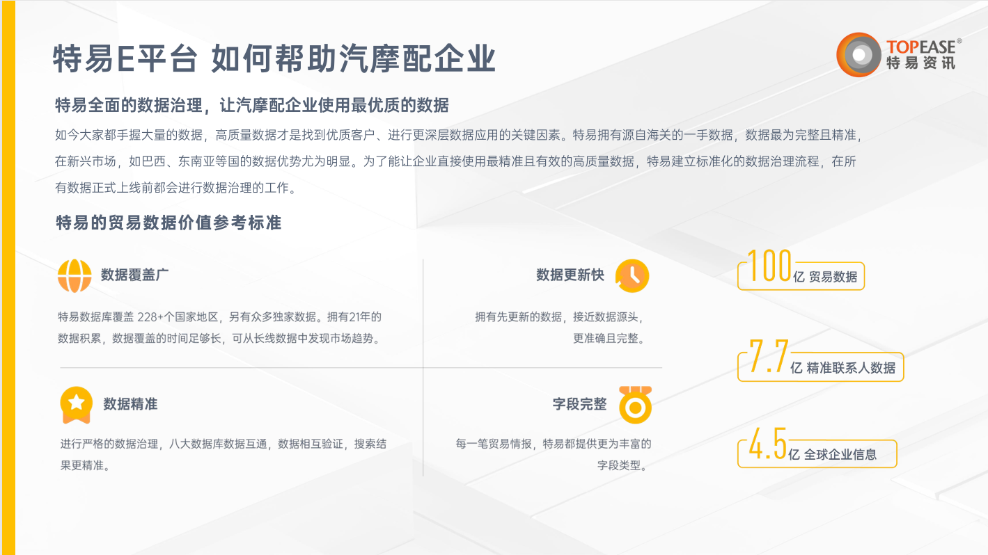 汽摩配外贸客户开发用海关数据的核心,是“靠车型适配精准对接,凭采购规模聚焦优质”。特易外贸资讯宝通过细分功能让这两大技巧落地,帮助企业从海量数据中锁定匹配客户;特易E平台则通过整合与智能化,让筛选出的客户资源高效转化为订单。借助这类专业工具与技巧,企业可摆脱“广撒网”的低效模式,在全球汽摩配市场中建立稳定的合作体系。